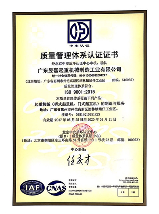 昱嘉起重机9001证书中文