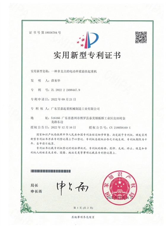 专利证书——一种多支点的电动单梁悬挂起重机